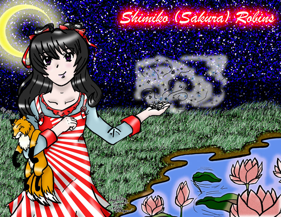 This is of Sakura (er…Shimiko, but her nickname is Sakura.) She’s in Dark Horse but hasn’t appeared yet. I’ve got her written into the script, though. I think she enters in Act 3 or 4. One or the other. She’s only 12, but a child prodigy, and she has telekinesis! What more could you want? Er…maybe some people skills. She’s holding a little fox dæmon named Tojyo. He has not been written in yet, but I plan to put him somewhere.